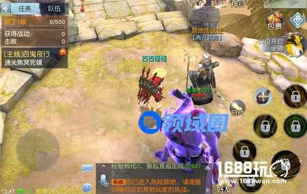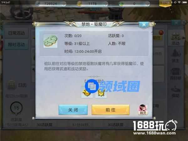 组队前往对应等级的禁地驱散妖魔将有几率获得驱魔印,使用后获得武道和战功奖励。