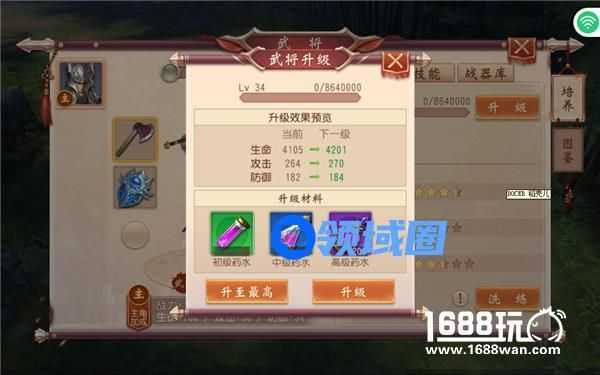 武将升级 使用武将经验药水可以提升武将等级,升级后会增加武将属性,但是武将等级不能超过主角等级。