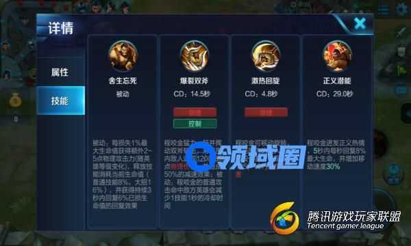 舍生忘死:被动技能,每损失1%最大生命值可获得额外物理攻击加成;释放技能消耗生命值,并获得持续3秒内生命回复的效果;