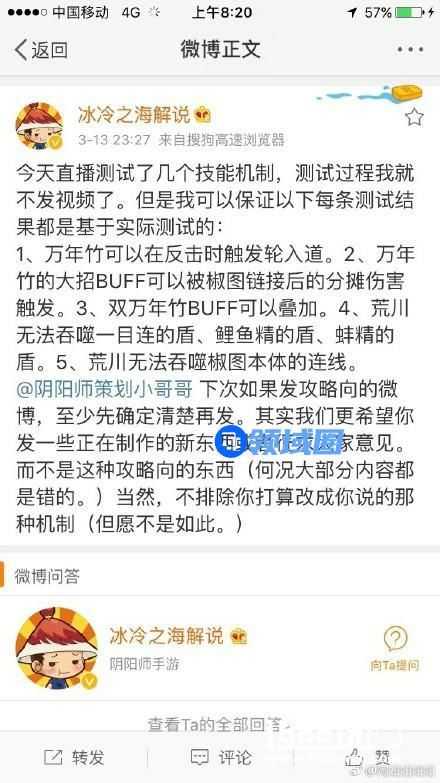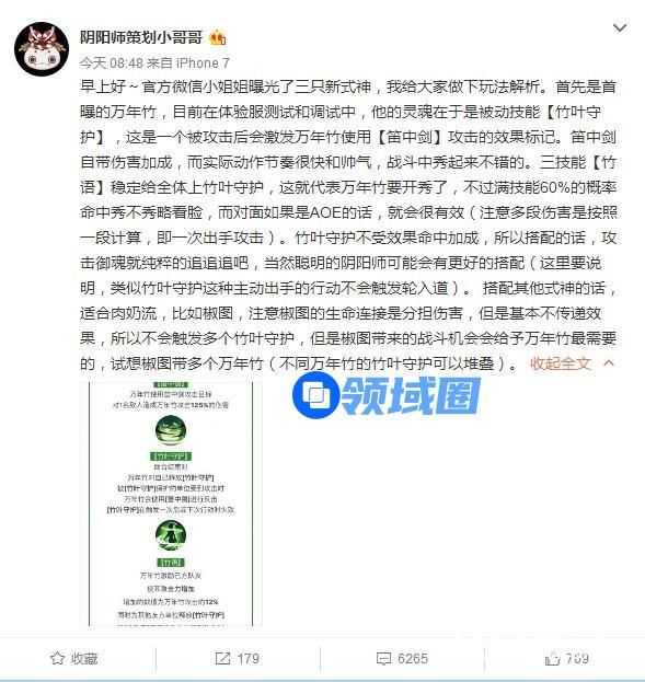 阴阳师官方策划在微博上放出了新SR式神万年竹的攻略解析,想来这算是最正确的资料了吧。但看过主播冰冷之海的体验服万年竹测试后,发现有不少出入。