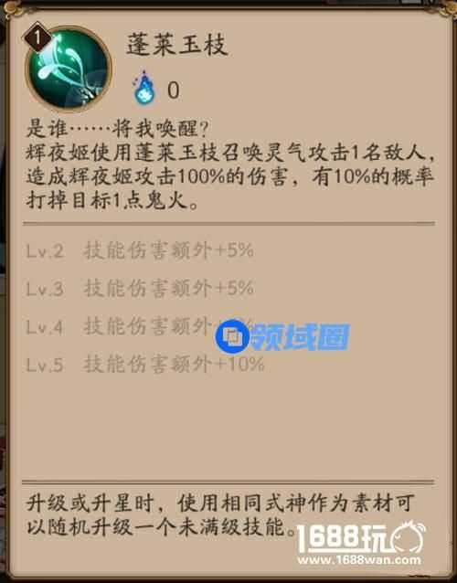 技能一:蓬莱玉枝,召唤灵气攻击敌人,对目标造成攻击100%伤害。有10%概率打掉对方一点鬼火。