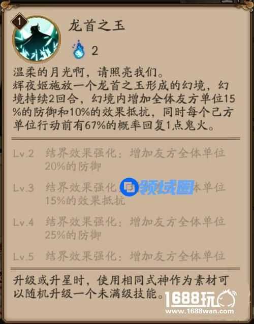 技能三:龙首之玉,施放一个龙首之玉形成的环境,持续2回合,幻境内增加全体友方单位15%的防御和10%的抵抗效果,同时每个己方单位行动前有67%的概率回复1点鬼火。
