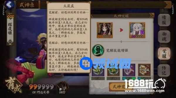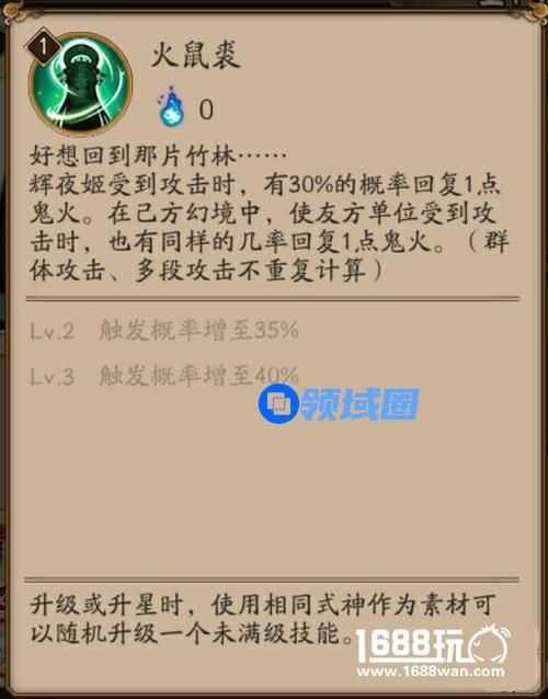 技能二:火鼠裘,受到攻击时,有30%的概率回复1点鬼火,在己方幻境中,使友方单位受到攻击时,同样有几率回复1点鬼火。(觉醒之后在战斗开始立刻施放幻境。)