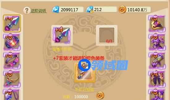 装备到达紫色+7或橙色+9可以进行装备进阶升级,进阶后颜色外貌发生变化,并且增加装备属性。