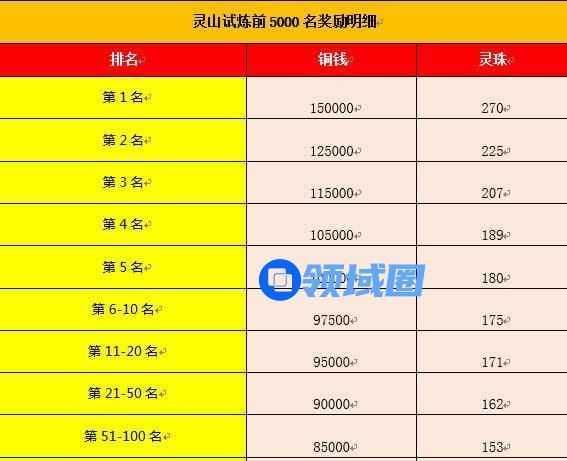 相信大家都知道,在灵山试炼中,排名越高,所获得的奖励就越高,系统每日会在21:00根据你的排名发放相应的铜钱和灵珠奖励,但由于排名的不同,奖励各有千秋,下表是目前游戏中前5000名奖励明细: