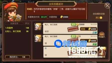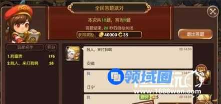 首先每题的时间是60秒,也就是一分钟,然后每题的基础奖励是2000金币,但是越快答出题目的正确答案奖励的倍数也就越高,最高奖励是可以叠加,也就说如果你十道题目全部答对的情况下那就是十倍的奖励也就是是20000公金币。在题目出来后的十秒之内答出此题,当然,全服只要是有玩家能连续答出十道题而且不出错的情况下都可以拿到累计奖励并且可以获得20积分。然后是全服最先答出的玩家将会奖励5龙币。