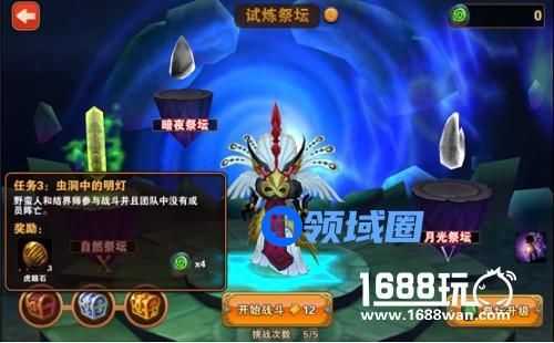 试炼祭坛每天都会有一个首领供我们挑战,界面左下角有三个箱子,代表着三个任务。右下角有个技能图标,该技能是当前首领自带的BUFF,我们出兵战斗前,一定要看清楚,然后再做出相应的应对,战斗才会有意想不到的效果。