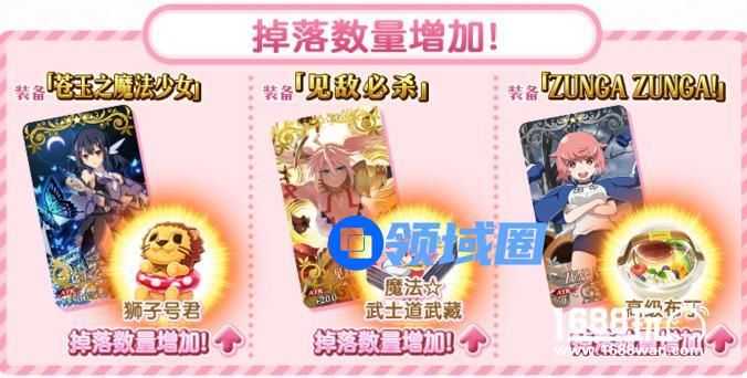 装备活动限时概念礼装,可分别提升活动道具「狮子号君」「魔法☆武士道武藏」「高级布丁」的掉落获得数量。