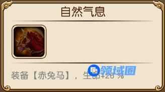 自然气息:装备赤兔马,生命+26%(德鲁伊亲近自然,才会得到神骏赤兔马的喜爱!)