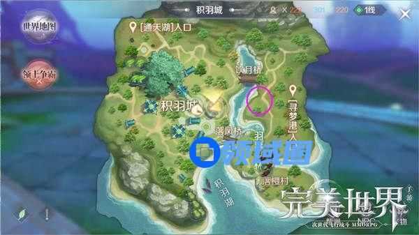 这个任务我们要前往羽族主城(积羽城),而后打开地图,找到(饮月桥)这个区域,但是我们并不是直接过去(饮月桥),而是前往(饮月桥)下方的位置,如上图所示。