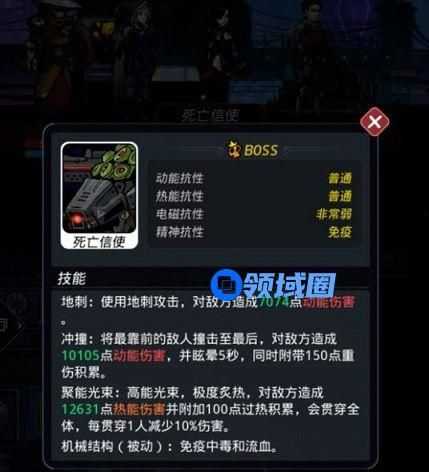 跨越星弧死亡信使BOSS有着冲撞、地刺、聚能光束和被动机械结构技能,精神抗性免疫但电磁抗性低,如何无压力击杀死亡信使呢?和小编一起来看看吧。