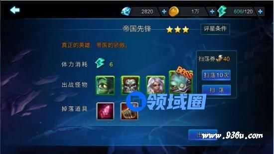 玩家可通过冒险闯关来提升英雄等级以及召唤师等级,每次参与需要消耗一定量的体力,体力可以自然时间恢复,等级提升增加或是蓝钻购买获得。在冒险副本中可以获得装备、装备图纸、英雄碎片以及经验类药水。在当前冒险关卡中的星星数量达到3星的时候即可点击扫荡。