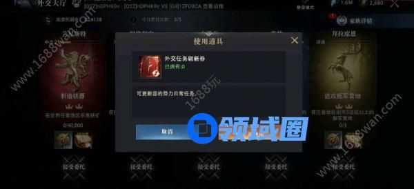 但委托任务有每6小时才刷新一次的设定,若当日的4次刷新都无法给我们刷新出合适难度的任务,选择委托界面的自行刷新领更合适任务无疑是更好的选择。点击委托界面左上角的刷新图标,使用[外交任务刷新券]就可进行相应刷新了。当前委托界面没有想做的任务、又不想等6小时后系统自动刷新时都可以试试。