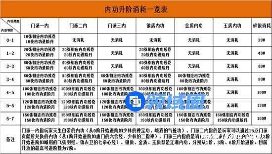 解析:可以看出,内功所需的消耗品主要有残卷、内功进阶丹和碎银,其中内功进阶丹和碎银较易获得,相对收集较为容易。不同类型内功残卷的收集难度不 一,按收集难度从易到难划分为:门派一内<门派二内<门派三内<银质内功<金质内功<玉质内功。其中门派内功全部可以通过门派贡献兑换,较为容易;部分江 湖银质内功和金质内功也可以通过禁地阅历兑换,收集起来难度较小;但更多金质内功和全部的玉质内功只能通过交易行购买或者击杀BOSS等方式掉落,而且所 需数量巨大,收集难度非常高。