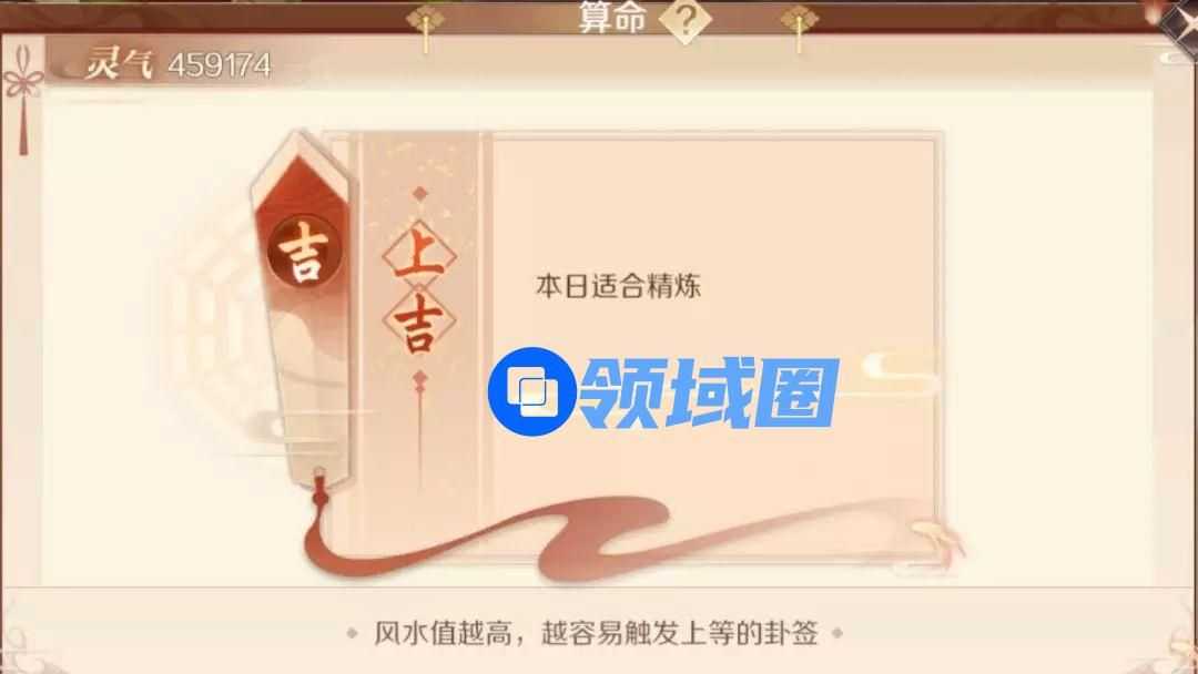 在算命玩法中,修真者每天可以获得一个运势卦签,风水值越高,越容易触发上等卦签!卦签中能够获得精炼成功率提升,更容易掉落橙材等诸多运势加成哦~