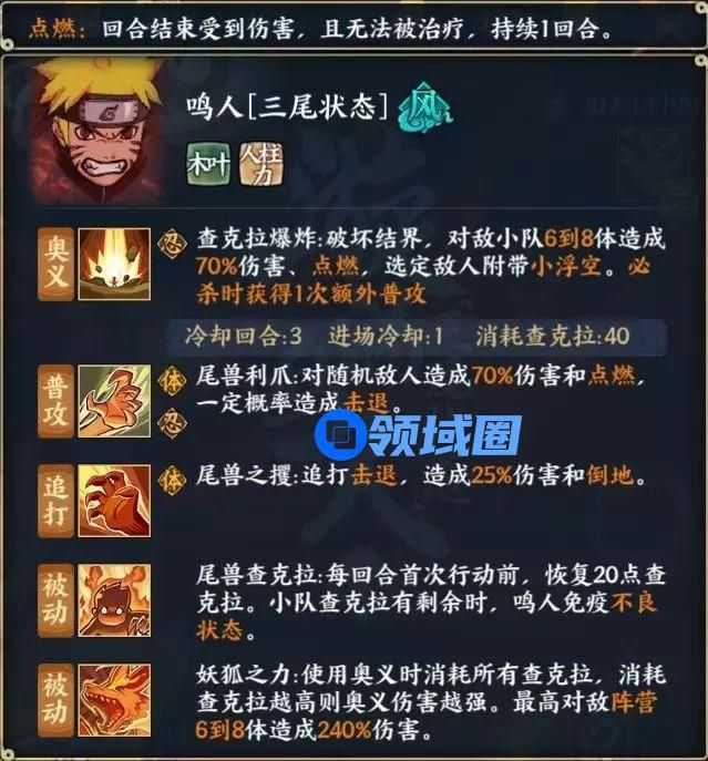 从面板上看,三尾鸣人的优势在于奥义和被动,奥义具有破坏结界、点燃和群体输出的能力,在被动“妖狐之力”的加成下,该奥义具备打出280%伤害的可能性;而被动“尾兽查克拉”在小队拥有查克拉的情况下,鸣人可以免疫不良状态。