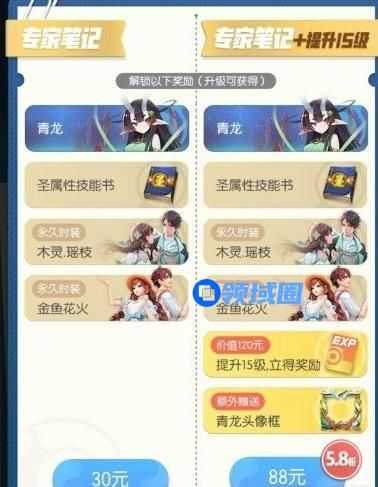 普通专家笔记售价30元,其中内容包括妖灵青龙、永久时装木灵·瑶枝、永久时装金鱼花火,高级专家笔记售价88元,其中内容包括妖灵青龙、永久时装木灵·瑶枝、永久时装金鱼花火、15级经验卡、青龙头像框。