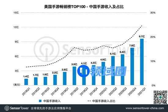Sensor Tower监测数据显示,Q1美国手游市场规模超61亿美元,其中23款中国手游产品入围美区畅销榜Top100,吸金近10亿美元,拿下24%的市场份额,再度创下最佳季度表现。