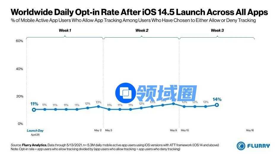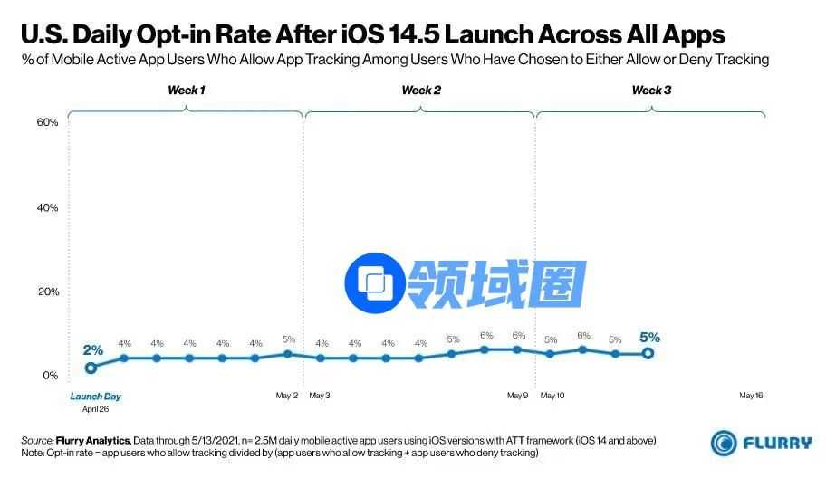 而在美国本土,选择开启跟踪的比例则更低,数据显示最低只有4%的用户允许APP跟踪。但后续的数据显示,随着iOS14.5推出的时间越长,无论是美国还是全球市场,选择开启IDFA的用户比例有了些许回暖。这可能跟后续APP紧急添加的弹窗(提示用户开启IDFA)有关,但变化的幅度仅在1%左右,对整体结果影响不大。