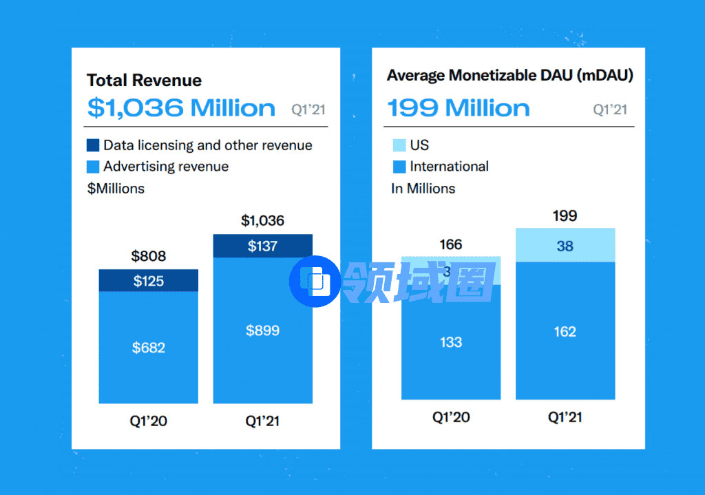 两周前的5月1日,twitter发布了公司2021年Q1的财报,财报显示公司在Q1的用户增长和收入增长同比要表现更好。美国的mDAU增长了13%,国际市场的mDAU增长了22%,总收入达10.4亿美元,同比增长28%。