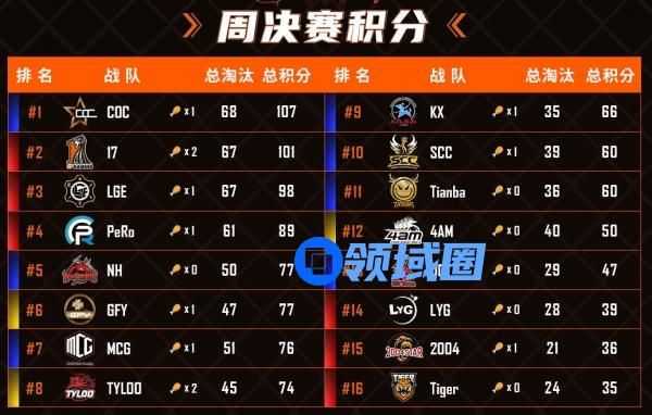在第二周的周中赛中,GFY战队表现出了强大的统治力,以98分的总积分与57个总淘汰的数据,强势夺取本周常规赛积分第一名与淘汰榜第一。NH战队一扫首周阴霾,不仅以1035的场均伤害异军突起,还拿下了53个淘汰,以90分的总积分取得第二。MCG战队则依旧保持稳定的战斗状态,以两分的微弱差距屈居第三。除此之外,TYLOO战队与17战队均以85分的总积分分列第四、第五,率先确定周决赛席位。