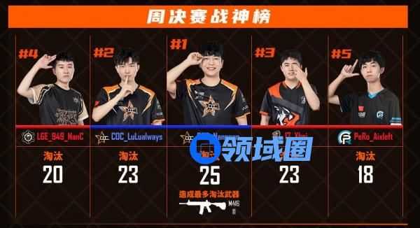 本周周决赛的激烈程度令人意外,周中赛位列第八的COC战队锋芒尽显,核心队员Nannnnn一展大将之风,在周决赛首日四场蛰伏后凭借一颗大心脏带队拿下最后一鸡,翌日带动队友LuLualways火力全开,周决赛12场分别斩获25和23个淘汰。两人在帮助队伍夺下周冠军宝座的同时,也顺势斩获本周战神榜一、二位,整队的场均伤害也顺利突破一千大关。