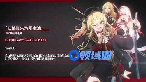 3月25日更新维护后 – 4月14日23:59期间,「心跳真朱湾限定池」限时探索开启,活动限定战姬约克公爵SSR、鲛SSR、豪SSR探索概率UP~快来获取心仪的战姬吧~