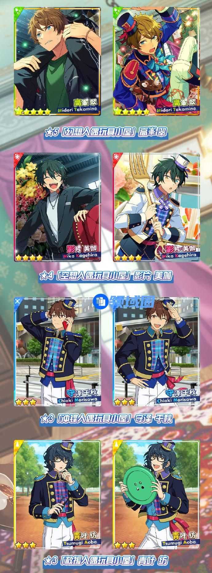 全新限定卡池「招募!人偶玩具小屋」目前已正式开启,将于3月26日22:00结束招募。5【幻想人偶玩具小屋】高峯翠、4【空想人偶玩具小屋】影片美伽、3【冲锋人偶玩具小屋】守泽千秋、3【救援人偶玩具小屋】青叶纺,五张活动卡牌在活动卡池掉率提升!