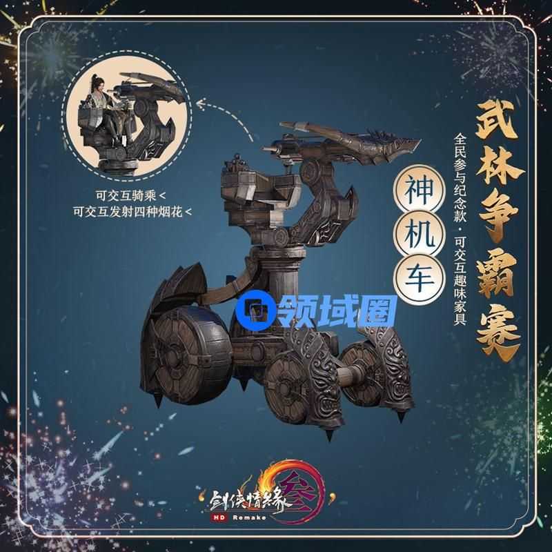 本次“武林争霸赛”诚邀广大侠士参与其中,共同品味攻城略地的热血激昂!参赛后获胜1场,每位参赛侠士即可获得1颗绑定版【五行石(八级)】、10枚【战意江湖符】及10,000威望奖励,通过邮件发放。而参与4场比赛后,每位参赛侠士即可获得1个【武林争霸赛专属纪念称号】、1个【争雄宝箱】、1件【遗失的美好】,以及1件纪念款可交互趣味家具【神机车】,同样通过邮件发放。这件全民参与纪念款的可交互趣味家具【神机车】以侠士们熟知的攻防战载具为原型打造,安置家中尽显威武霸气!不仅如此,侠士们还可与之进行交互骑乘,并可发射四种不同的烟花,趣味十足!