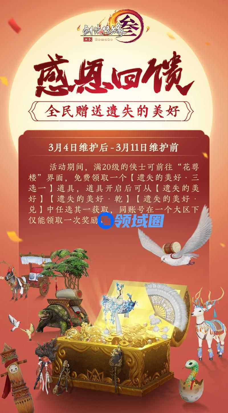 近期西山居旗下产品屡次遭到不法分子的网络DDos攻击、服务器入侵等不法行为,在此我们建议诸位侠士修改短位密码,绑定密保锁以提升安全等级,已绑定的侠士则无需担心!此外,为了答谢侠士们的理解与支持,《剑网3》为大家奉上【遗失的美好·三选一】感恩回馈!3月4日维护后至3月11日维护前,所有满20级的侠士可前往运营活动界面“花萼楼”,免费领取一个【遗失的美好·三选一】道具,道具开启后即可从【遗失的美好】、【遗失的美好·乾】、【遗失的美好·兑】中任选其一获取,以感谢侠士们的支持与喜爱!资讯君在此提醒,同账号在一个大区内仅能领取一次奖励,还请侠士们多加留意!
