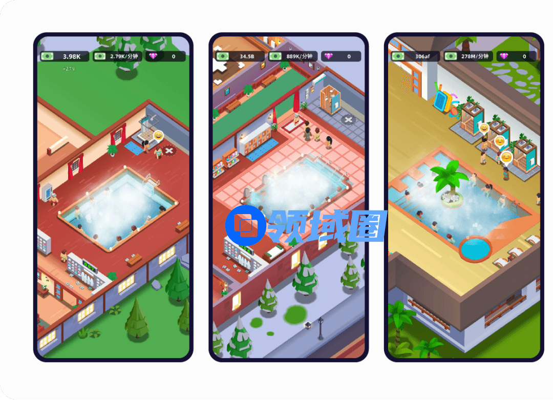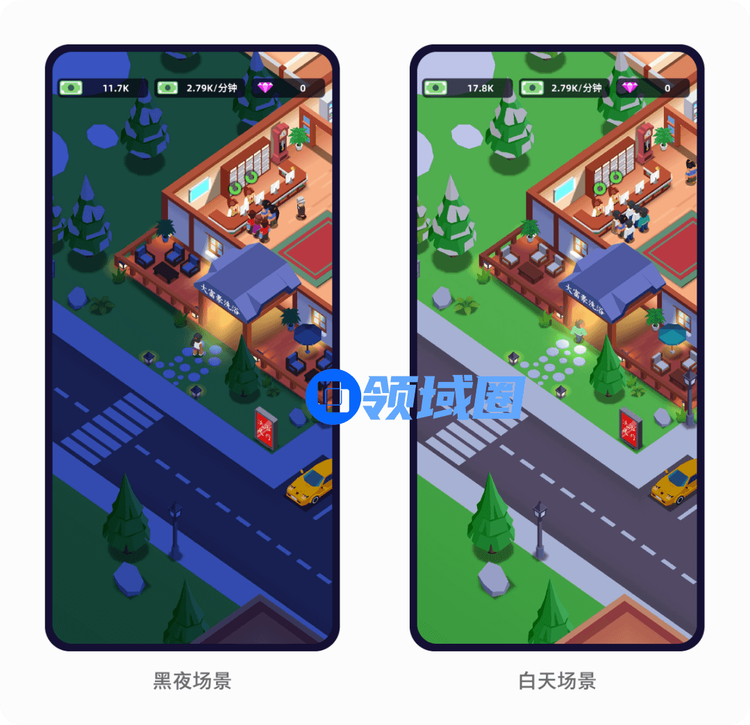 在美术上,《洗浴中心大亨》尤其重视细节呈现。通过打造真实情境提高游戏代入感,并采用3D模型提升画质,主场景鲜艳明亮、色彩饱满。此外,结合搭建多元交互场景、设定白天黑夜模式、添加emoji等多重设计,大幅提升玩家互动体验。