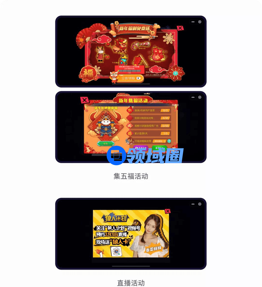 调优阶段,游戏优选创造稀缺资源并用活动释放,配合春节“集五福”活动,充分激发游戏用户兴趣,最终使广告互动频次提升50%。投放推广上,游戏采用激励视频广告形式,以沉浸式玩法提升转化效果。值得一提的是,《狼人计划》创新采用直播方式来刺激用户社交裂变,使得用户规模与流水不断提升。