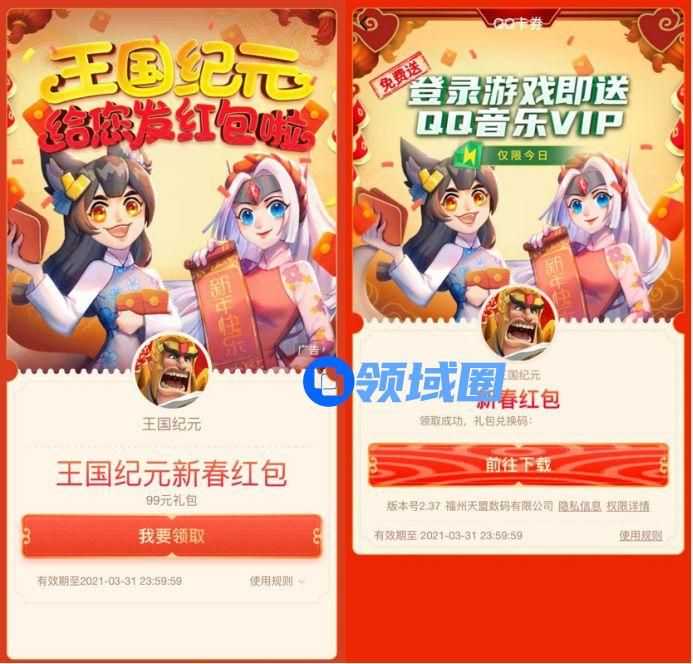 除夕当晚,全球知名游戏厂商IGG出品的战争策略手游《王国纪元》,联合腾讯QQ为9亿用户派发了过年红包:不仅现金红包和游戏礼包让人拿到手软,活动期间通过手Q下载游戏的新用户,在次日登录游戏后还可领取QQ音乐会员等惊喜好礼!除此之外,《王国纪元》还推出了多套微信红包限定封面,让每一位玩家抢红包时都有与众不同的仪式感。