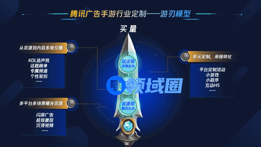 腾讯广告推出针对手游行业定制化整合营销的游刃模型,对整合营销做了一个资源分层。主要包括:第一层基础资源层,第二层内容层,第三层玩法层。腾讯广告会根据客户预算的大小和差异化需求,给到不同层次的玩法建议。而《最强蜗牛》是很好的把这三层都利用了起来,最后通过全平台买量实现效果的回收。