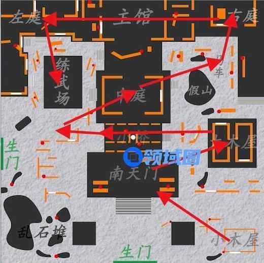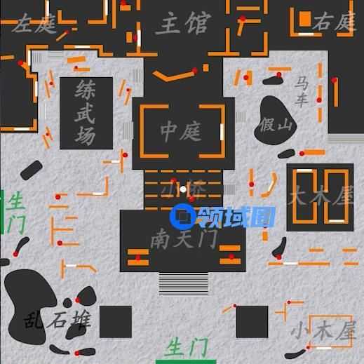 那么在这张地图中想安全溜鬼,我们首先要熟悉各个点位。主馆、中庭、小桥、南天门位于地图主轴线上,左庭右庭位于主馆两侧,中庭左侧是练武场,右侧是假山和马车,小桥左侧是经典LT,LT下方则是乱石堆,还有似曾相识的大木屋和小木屋。为什么要说似曾相识呢,因为小木屋的两板一窗变成了一板一窗,而且火盆还被放在了屋外,而大木屋则一个火盆也没有,所以大木屋不再是一个很好的溜鬼点位,只能作为转点位来使用。