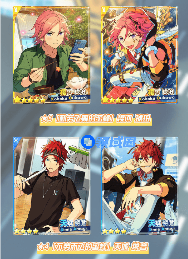 2021年1月1日12:00-1月15日11:59,全新限定卡池「招募!飞舞蜜蜂」正式开启!5【勤劳飞舞的蜜蜂】樱河琥珀、4【不劳而飞的蜜蜂】天城燐音、3【空腹飞舞的蜜蜂】椎名丹希、3【观察飞舞的蜜蜂】HiMERU,四张活动卡牌在活动卡池掉率提升!将活动卡编入队伍,也会获得「心灵交错/汽车展览会」演唱会活动的加成。