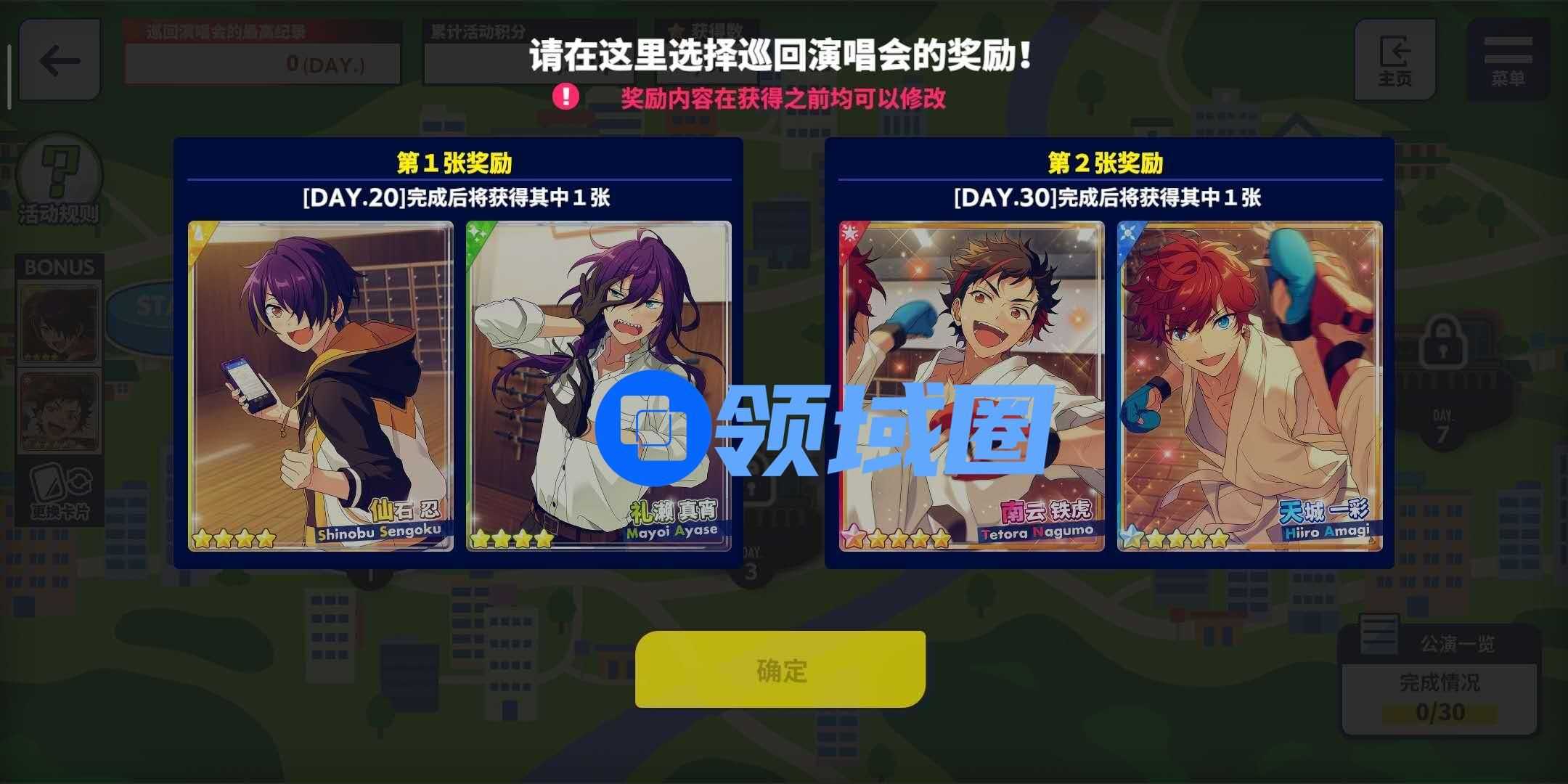 首先,制作人们需要选择本期巡演演唱会活动奖励。四星卡片二选一(未通关20关之前可以随意更换):4【奉献的汽车展览会】仙石忍、4【幽微的汽车展览会】礼濑真宵。五星卡片二选一(未通关30关之前可以随意更换)5【正义的汽车展览会】南云铁虎、5【前进的汽车展览会】天城一彩。