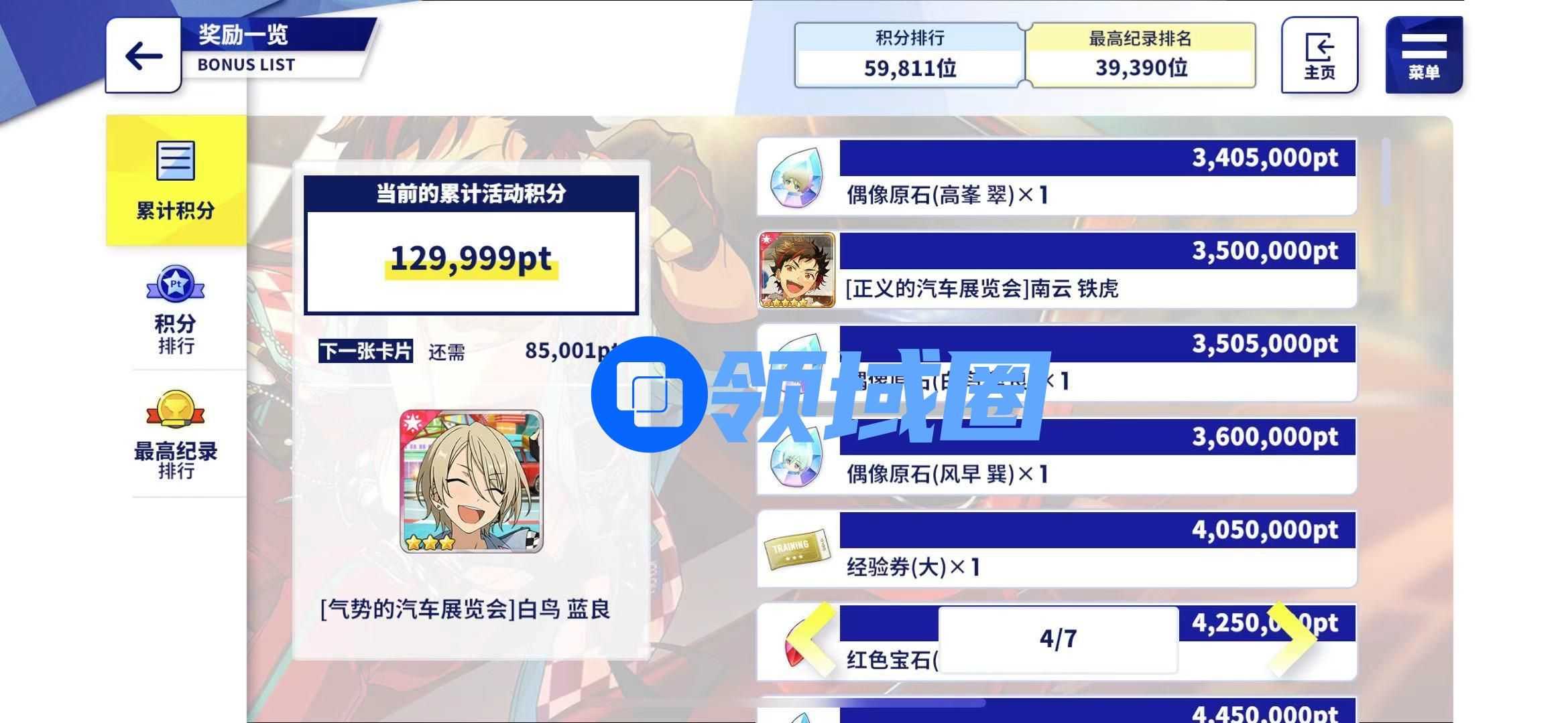 同时,本次巡演演唱会活动也是有活动积分奖励的,和之前的活动类似,完成演唱会和偶像工作收集活动pt,可获得活动限定卡片等奖励!累计3,00,000活动pt可以获得5【前进的汽车展览会】天城一彩,累计3,500,000Pt可以获得5【正义的汽车展览会】南云铁虎。因此在本次活动中,各位制作人们有机会获得双五星奖励!