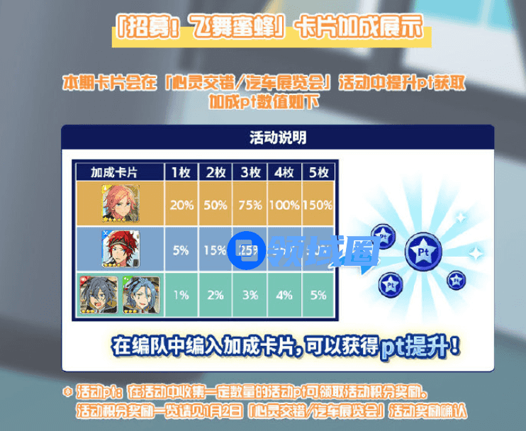 活动pt和演唱会举行的分数有一定相关性,大家可以尽量让高阶、高等级、原唱、与歌曲属性相同的角色出场,这样就会获得更高的演唱会分数。同时「招募!飞舞蜜蜂」限定卡池中的卡片,在活动中会获得pt加成。