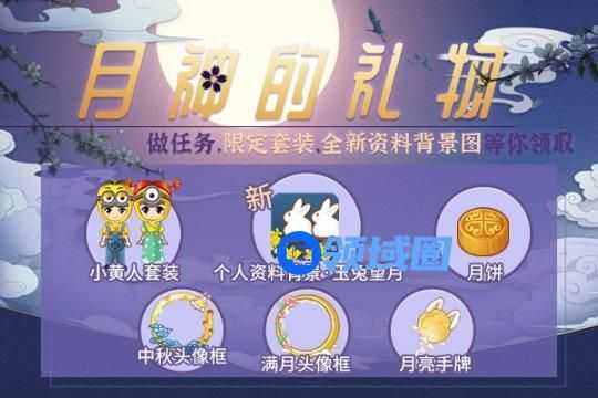活动期间,每完成一份活动限时任务可以获得“祝福”,收集的“祝福”越多,获得的奖励就会越多!当累计获得100祝福时,即可领取“中秋大礼包”,内含:(绑)小黄人套装x90天、全新个人资料背景·玉兔望月x永久、月饼x3。
