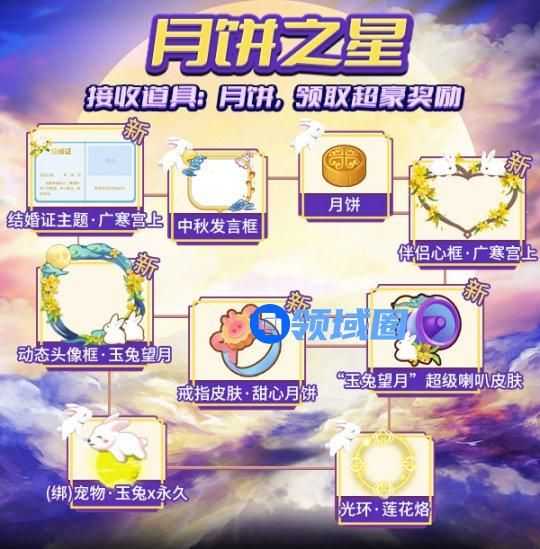 活动期间,根据您累计接收的非绑定讨好道具:月饼的数量领取奖励,包含:全新结婚证、伴侣心框:广寒宫上,动态头像框·玉兔望月和全新戒指皮肤·甜心月饼!