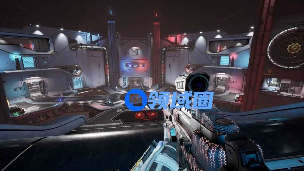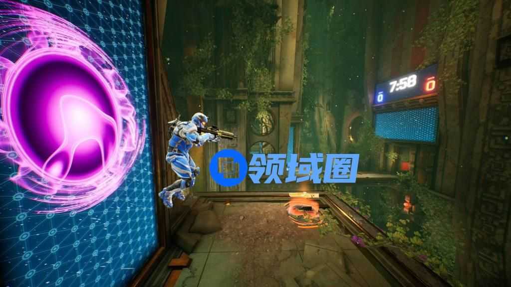 与《传送门》系列一样,《Splitgate》中所加入的传送门同样具备空间穿梭的能力,每个玩家都可以在任意两个制定的区域摆放传送门,实现位置的快速转移,而可摆放的区域会通过蓝白交叉的网状图案标识出来。
