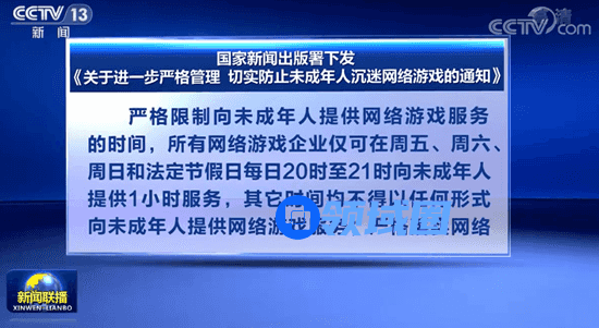 昨(30)日,国家新闻出版总署下发《关于进一步严格管理 切实防止未成年人沉迷网络游戏的通知》(下文简称通知)文件,要求游戏厂商进一步压缩未成年人游戏时间:从原来(18年)的法定节假日每日游戏时间累计不得超过3小时,其他时间每日累计不得超过1.5小时缩短为周五、周六和周天每日1小时,且其余时段不得向未成年人提供游戏服务。
