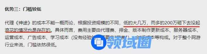 按照商务人员的说法就是「不能一概而论」,代理成本从几万到几百万都有,具体杂七杂八的成本甚至包括了所谓的学习成本,没有游戏运营、推广经验的代理商大概率都会扑街。言简意赅就是概不负责。