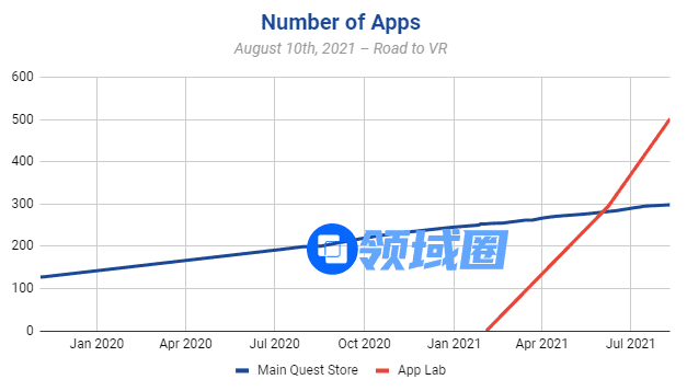 自从2月3日上线以来,平均每天都有2.7款应用登陆App Lab。作为比较,Quest主商店推出至今,平均每天只接受了0.37款新增应用。另外,目前Oculus PC和Oculus Go应用均为大约1800款,而SteamVR应用数量则达到了约5000款。