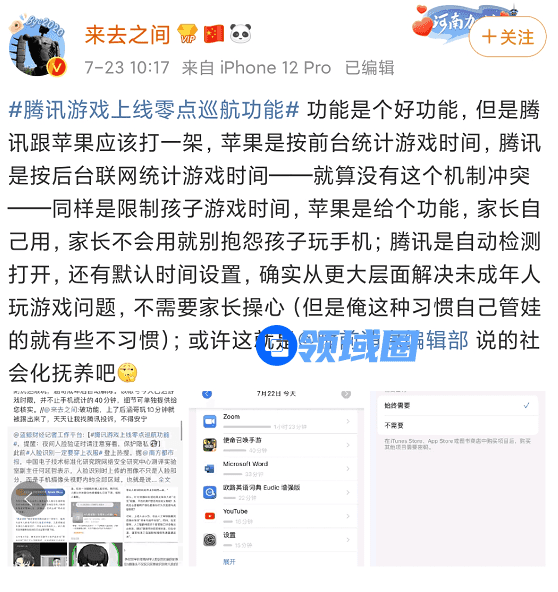 前段时间来总微博上夸赞腾讯的零点巡航功能,和苹果的系统比起来,腾讯的零点巡航根本不需要家长担心,腾讯以一种“社会化抚养”模式,让孩子在玩游戏时能够收到监督,解决了不少未成年人沉迷游戏的问题,看得出来总对于腾讯此番行为的肯定。