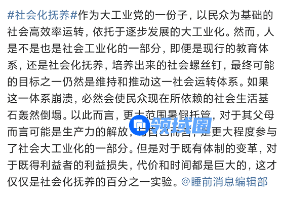 正如睡前消息栏目所说,如今社会家长主要注重劳动生产,对于孩子管教不够,这个时候就应该由相关部门和企业承担起抚养孩子的义务,社会化抚养机制的诞生,能够让家长脱离对孩子的关注,从而全身心投入社会劳动生产上来,腾讯也在积极筑造该种模式,以便解决家长对孩子沉迷游戏的担忧。