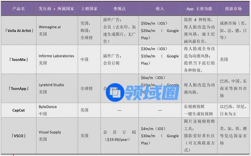 另一类图片及视频剪辑类 App 分别为「Voila AI Artist」、「ToonMe」和「ToonApp」以及「VSCO」,发行商都是美国,尤其是在 Q2,美国厂商主导了一波漫画脸风潮。除了「ToonMe」在中国上榜之外,其余 3 款 App 都在美国成绩最好。其中,「Voila AI Artist」的成绩最为亮眼,这款 App 从 6 月 3 日进入美区 iOS 下载总榜,并连续 8 天位于总榜第 1。这款 App 利用 AI 技术将人脸转换成不同的动漫风格,虽然到目前为止只有 4x3 个特效,但风格鲜明,具有记忆点。