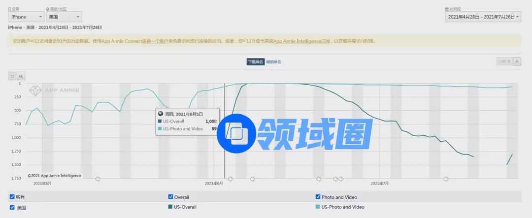 「Voila AI Artist」iOS 版本 4 月-7 月美国下载排名变化 | 来源:App Annie