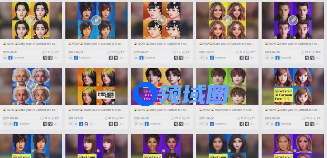 从上图去看,虽然总榜排名掉了下来,但是视频/图片 App 榜单还有一定成绩。笔者搜索了「Voila AI Artist」成绩最好的 6 月的投放素材,可以看到,这款 App 利用迪士尼风格和名人换脸图这 2 点作为出圈手段,「Voila AI Artist」选择了大火的欧美及韩流明星的换脸图作为投放素材,6 月份双端实现 70 万美元的收入,是这些上榜的不强制订阅的修图+视频剪辑 App 中收入最高的一款。而这些素材也决定了这款 App 在美国和韩国增长最快,进入了这 2 个国家和全球突破榜单。
